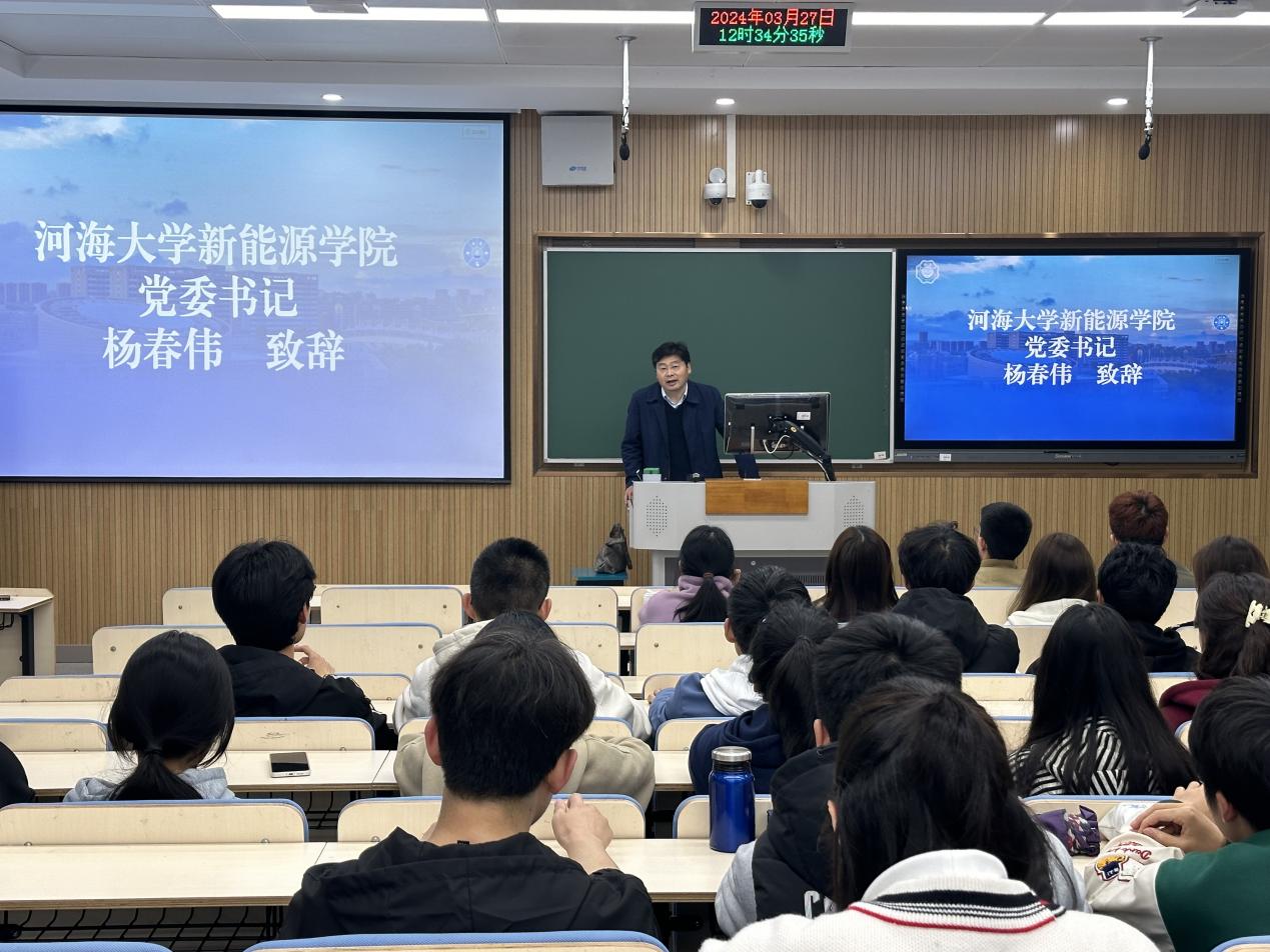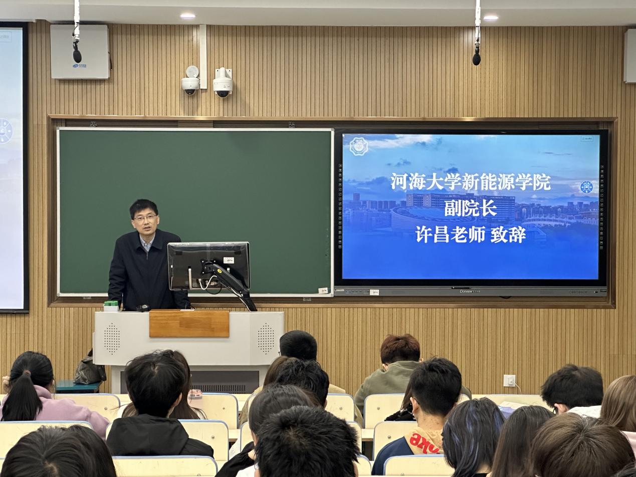 公司副经理许昌致辞。许经理向同学们详细介绍了专业前景和近期的学科工作。首先,新能源学科与双碳政策联系最紧密。其次,目前新能源专业就业情况明朗,多家优质企业与河海新能源都有合作。最后,许经理提及了学院学科规划,预计拓展太阳能方向、储能方向学科。最后,许经理对大一同学们表达了真诚的期望与祝愿,表示希望betway88西汉姆联员工都能拥有光明的未来。