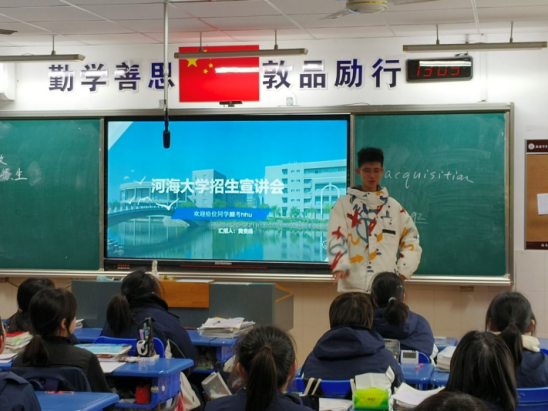 然后,黄贵扬同学与高三的同学们分享了自己入学betway88西汉姆联半年以来的生活体验,讲述了河海老员工活学习的精彩纷呈以及收获的提升与超越,充分吸引高三生们的兴趣,激发他们努力学习的热情。之后,黄贵扬同学将宣讲引入自由提问的环节,同学们从高考备考方法,学校招生政策,学院生活和学习体验等方面积极提问,现场气氛活跃。最后,团队成员和班级同学们合影留念。