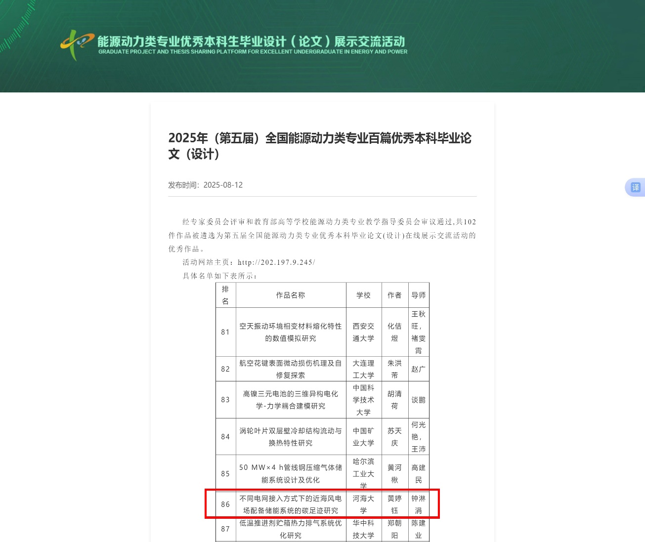 全国能源动力类专业百篇优秀本科毕业论文(设计)评选活动是由教育部高等学校能源动力类专业教学指导委员会组织举办,面向全国近300所高校能源动力类专业开展的全国范围评选活动。本届评选共有来自清华大学、浙江大学等79所高校的259篇作品参评,其中102篇作品获评优秀。