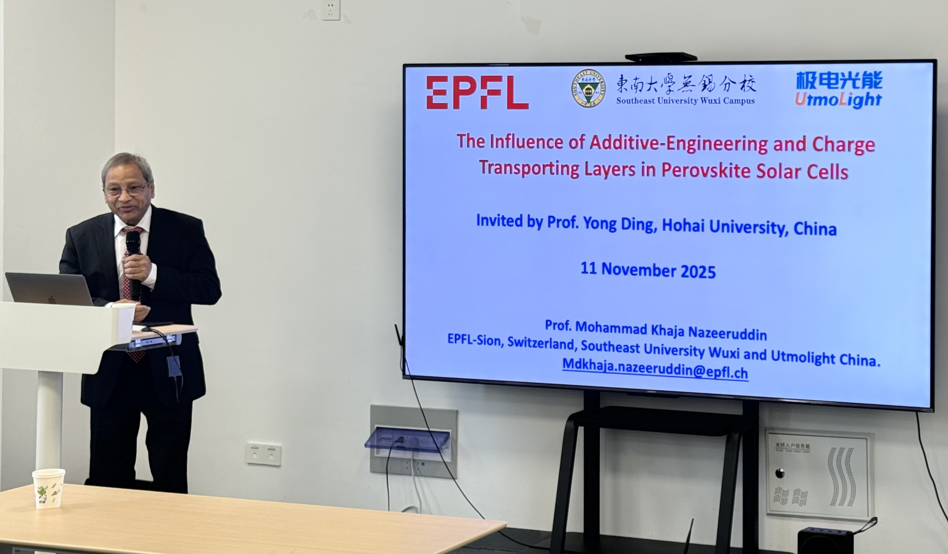 2025年11月11日,应公司betway88西汉姆联邀请,国际杰出科学家、瑞士洛桑联邦理工学院(EPFL)Prof. Md. K. Nazeeruddin教授莅临公司,作题为“Perovskite Solar Cells: A new Paradigm in Energy Sector”(钙钛矿太阳能电池:能源领域的新范式)的专题学术报告。报告在betway88西汉姆联会议室举行,由betway88西汉姆联丁勇教授主持。吸引了来自光伏、风电、材料等多个专业的师生参加,现场座无虚席,气氛热烈。