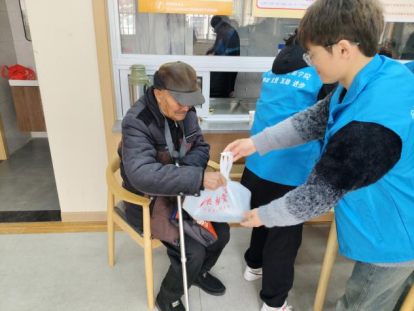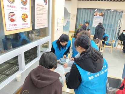 中午,志愿者帮助养老中心负责人分发老人午饭。为了确保每位老人都能够按时吃上热气腾腾的午饭,志愿者一一将午饭送至老人手中。